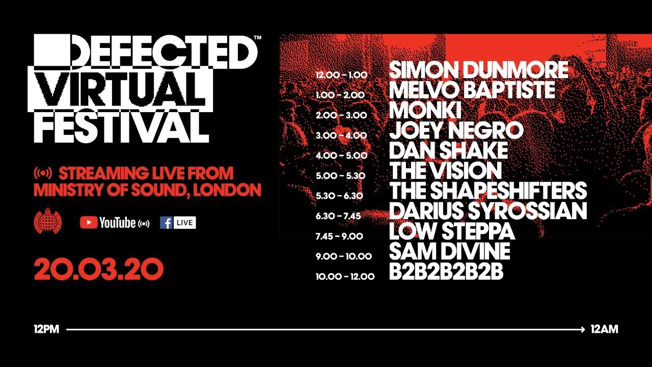 แต่คอดนตรีทั้งหลายไม่ต้องกลัวว่าจะเหงา เพราะว่าทาง Defected Records ค่ายเพลงแนวเฮ้าส์ชื่อดังจากลอนดอน ประเทศอังกฤษ ได้จัดแคมเปญพิเศษกับเทศกาลดนตรีแบบ Live Streaming ในชื่อว่า Defected Virtual Festival ที่ Ministry of Sound ในวันศุกร์ที่ 20 มีนาคม 2020 นี้ โดยแฟนๆ ดนตรี สามารถรับชมจากทั่วโลกกันได้แบบฟรีๆ ไม่ว่าคุณจะอยู่ที่ไหนก็ตาม